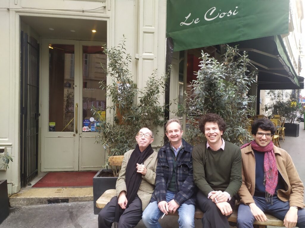 Trois générations de directeurs de thèse avec leur étudiant respectif à la porte du restaurant Le Cosi près du Panthéon il y a quelques années. De gauche à droite : Jacques Baudon avec Francisco Perales, Jules Grucker et Lionel Djadaojee.